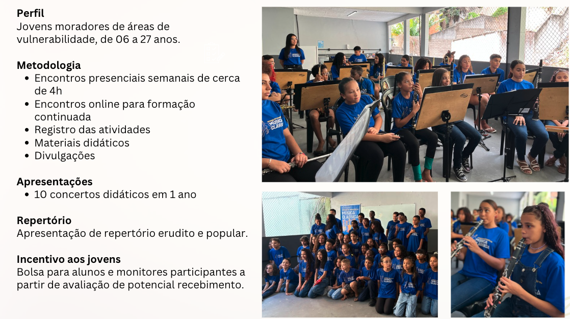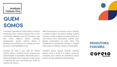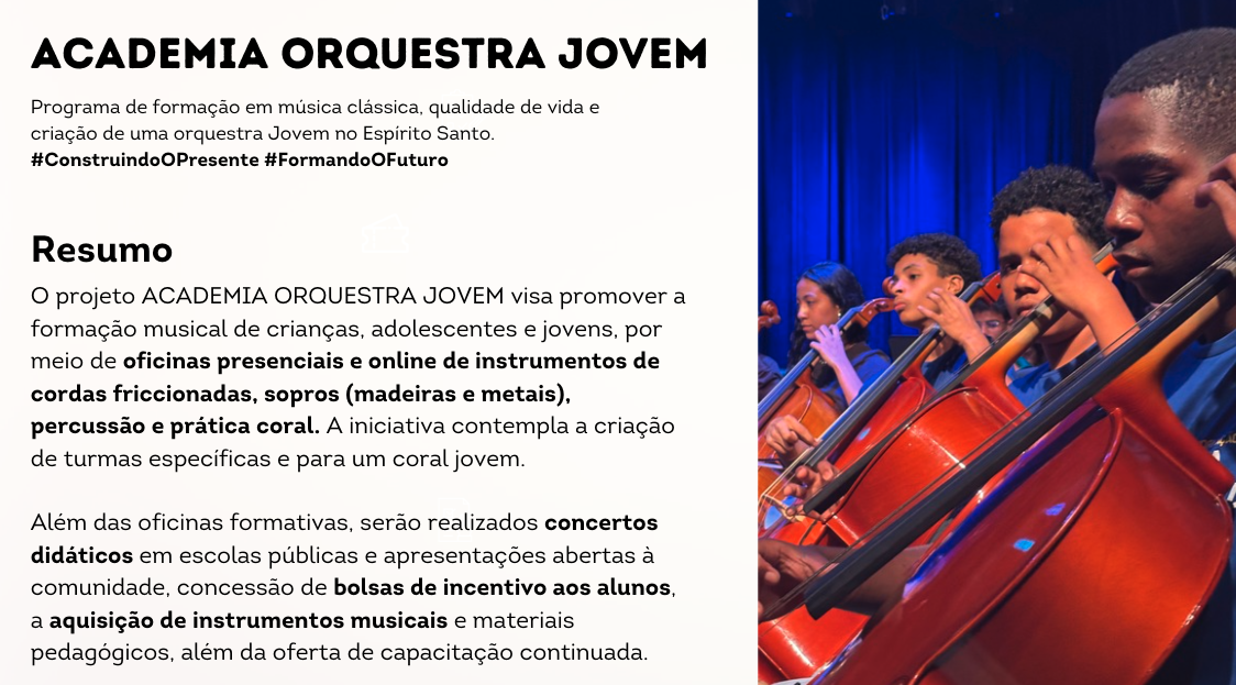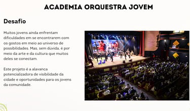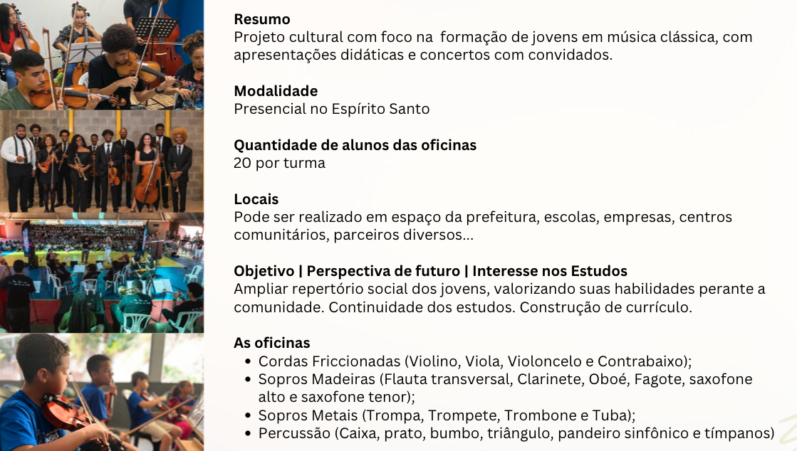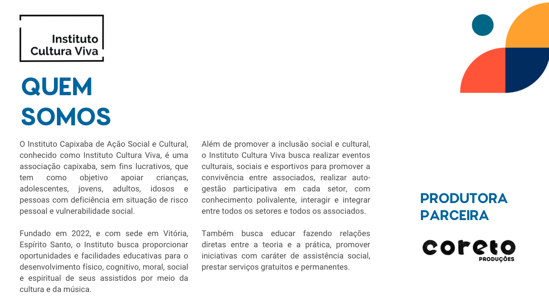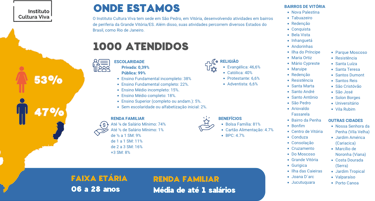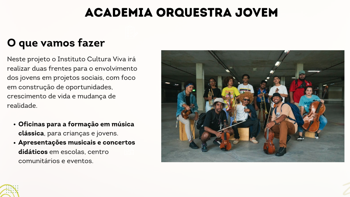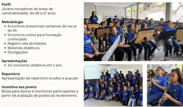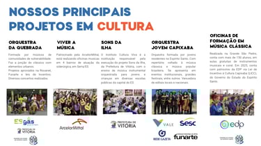 Somos uma instituição social que busca a transformação social através da arte, cultura, música e do esporte.